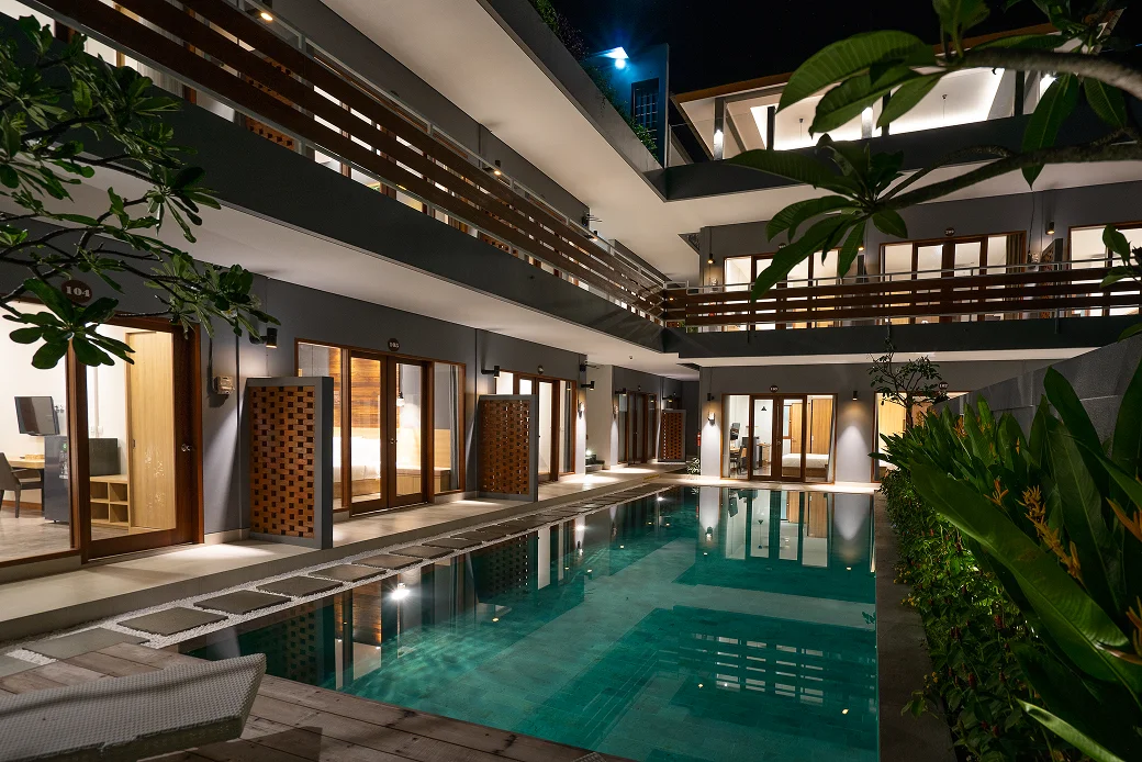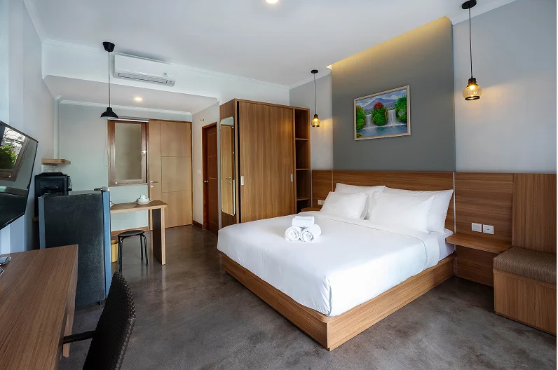 The standard size apartments are 25sqm with a studio-style layout featuring a comfortable bedroom, en-suite bathroom, kitchenette and private balcony. Filled with everything you could need to feel at home including a sumptuous king-size bed (or twin bed option), wardrobes, flat-screen TV and air-conditioning, you can unpack your belongings and make the place your own. Each of the apartments have their own style and decor, from burnt wood, to concrete, to exposed brick - there is a design to suit every preference.